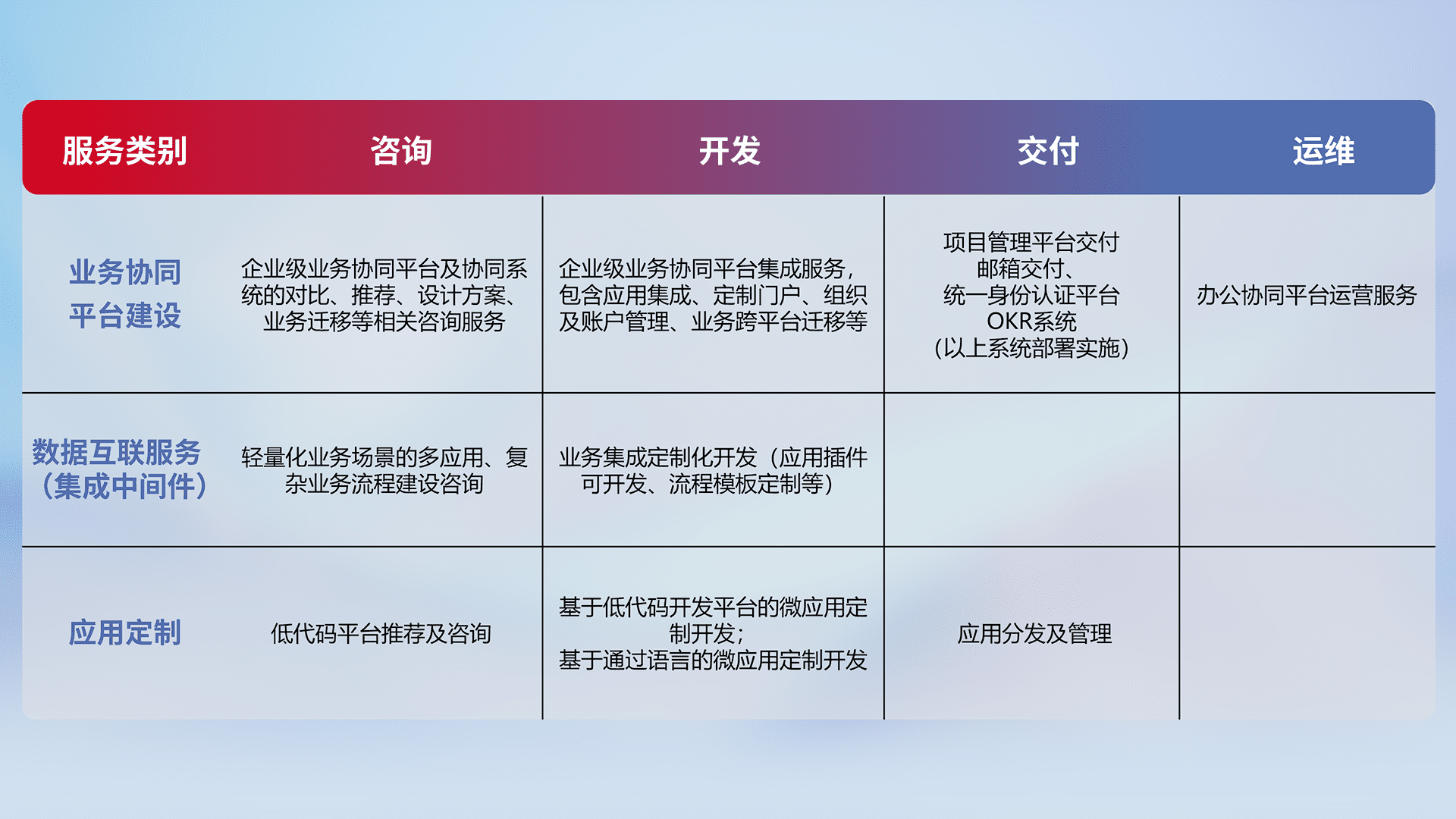 针对钉钉、、、、企微、、、、IDaas等平台级产品提供产品的规划、、方案、、、交付、、、定制化开发等服务,,,实现如统一协同办公、、智能客户服务、、混合会议管理、、智能数据查询、、等业务场景,,实现数字化转型。。。。